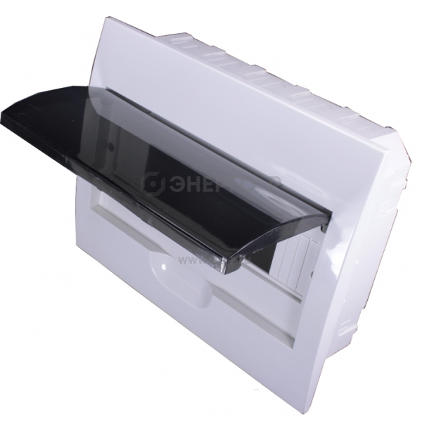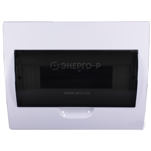 Пластиковый щиток с дымчатой прозрачной дверцей (дверью) встраиваемый в нишу, скрытой установки на 18 модулей для автоматов белый 18М