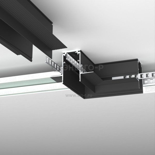 Коннектор угловой черный для встраиваемого шинопровода под ГКЛ 9,5мм Slim Magnetic. Служит для соединения встраиваемых шинопроводов под ГКЛ 9,5мм в одной плоскости под прямым углом 90°.