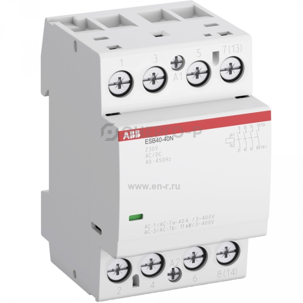 Модульные контакторы серии ESB40..N предназначены для управления однофазными и трёхфазными нагрузками с токами до 40А и могут управляться как переменным, так и постоянным током. Контакторы предназначены для применения как в жилом сегменте, так и в промышленности.