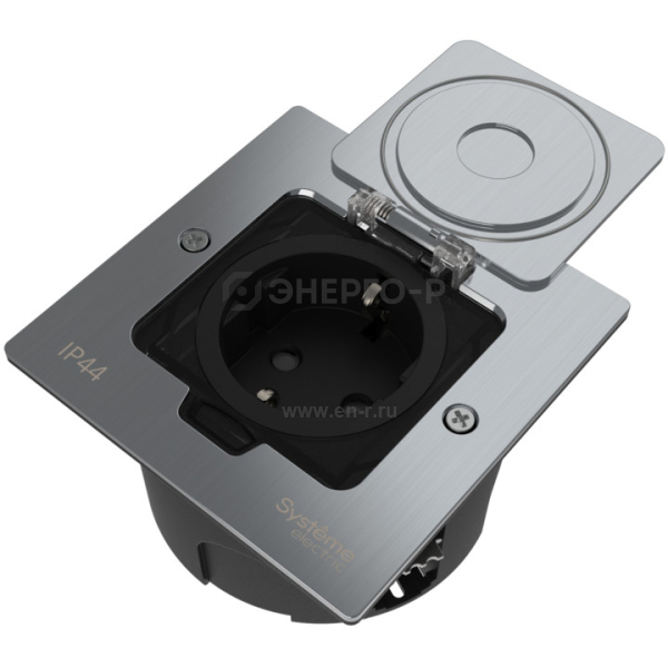 Лючок с розеткой 2К+З, 16А/250В, IP44 с коробкой д/стены,фальшпола,стола серебро тип MDK21 MultiDesk