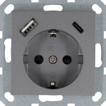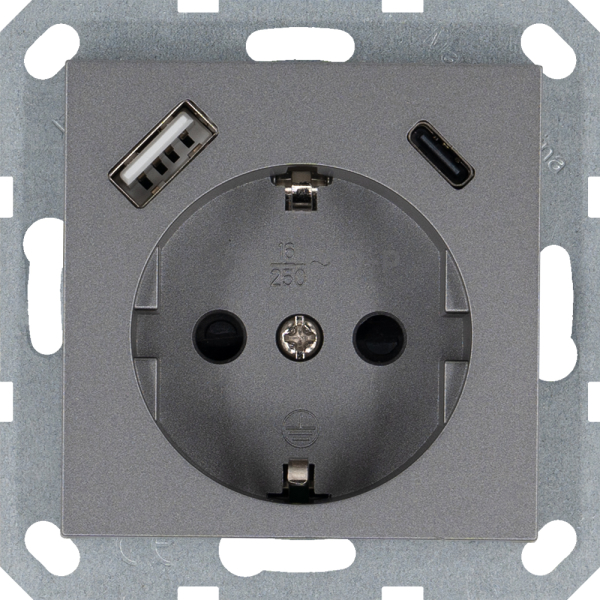 Розетка Schuko с USB A+C с защитными шторками 16A 250V~ 2P+T USB 25W, цвет Алюминий