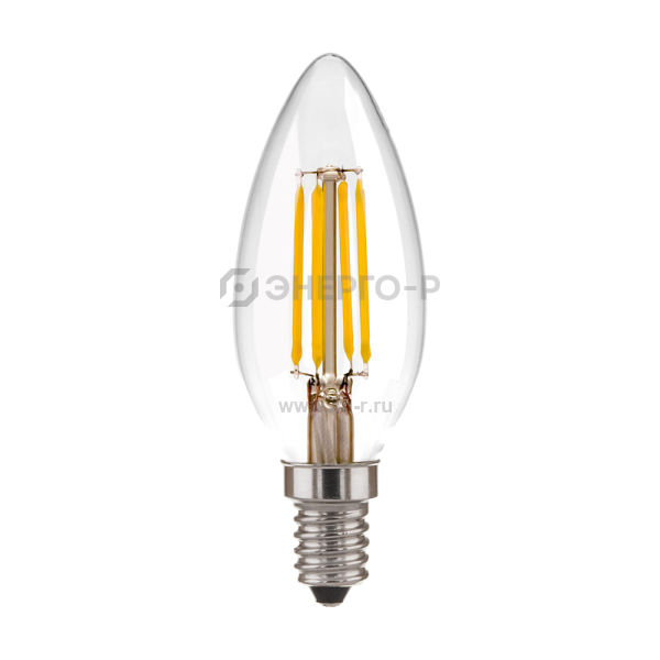 Филаментная светодиодная лампа "Свеча" C35 9W 3300K E14. Это вид светодиодных ламп, которые внешне максимально приближены к лампам накаливания. Они имеют полностью прозрачную стеклянную колбу и цоколь, а внутри расположены светодиоды вместо нити накала.