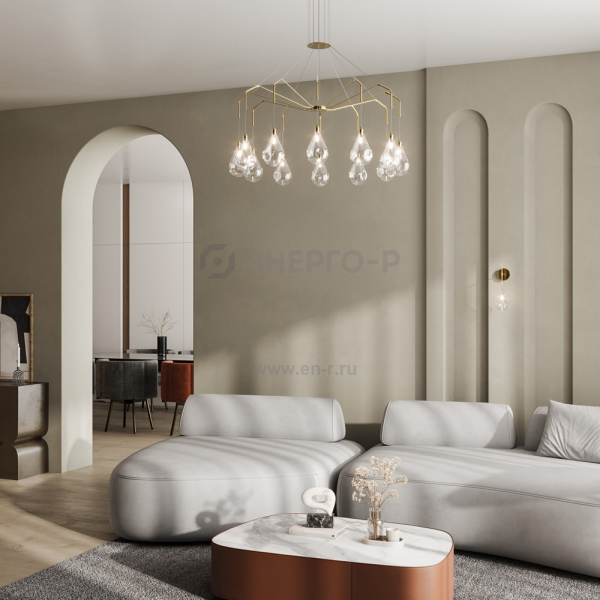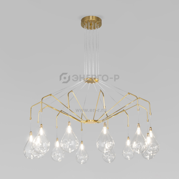 Каркас люстры, выполненный в благородном цвете латунь, служит надежной основой для прозрачных стеклянных плафонов. Их форма, словно застывшая вода, добавляет легкости и воздушности всей конструкции.