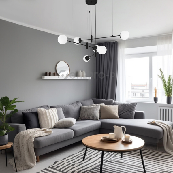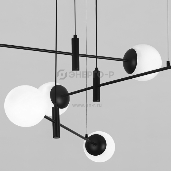 Подвесная люстра Planet вдохновлена хаотичным расположением планет в космосе и строгой геометрией форм. Открытая конструкция на тонких подвесах будто парит в воздухе, создавая ощущение невесомости и динамики элементов. Шесть белых матовых плафонов в форме шара мягко рассевают свет.